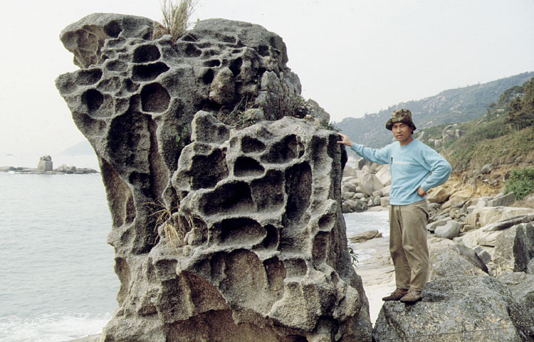 Cheung Chau. Equigranular medium-grained granite is well exposed on the coast of Cheung Shan, often displaying well-developed honeycomb structure on weathering (Plate 6.A18). The granite is light pink, weathers to a yellowish brown, and is very uniform in texture and appearance over the whole island. Numerous east-, to eastnortheast-trending feldsparphyric rhyolite dykes cut the granite. They often have well-developed chilled margins, for example, on the coast at Italian Beach (Pak Tso Wan) in southwest Cheung Chau (819990 806540 Kcc-1), and on the coast south of Fa Peng in southeast Cheung Chau (822080 807200 Kcc-2). In addition, the granite is cut by many small aplite (Plate 6.A19) and basalt dykes, and by thin quartz veins. South of the cemetery at Kau Kung Tong (820430 806640 Kcc-3), in southwestern Cheung Chau, there is an eastnortheast-trending zone of quartz veins alternating with aplite, up to 20 m wide. Localized kaolinization, probably the result of weathering, can be seen in an isolated exposure northeast of Cheung Kwai Estate (820820 808460 Kcc-4).