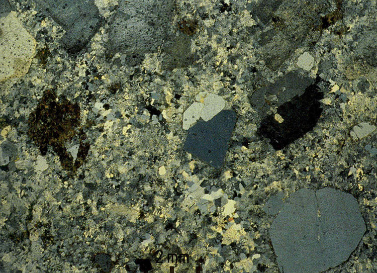 Numerous feldsparphyric rhyodacite dykes striking roughly east-west cut the granites of central and southern Lamma Island. Most average 20 to 30 m wide and extend over distances varying from 100 m to 2 km. The largest dyke attains a width of 100 m west of Shek Pai Wan (832000 806350 Kct-8), and further west this dyke divides into two branches (831690 806320 Kct-9). A similar branching of a feldsparphyric dyke occurs northwest of Mount Stenhouse (830700 806180 Kct-10). The dyke rock is characterised by a dark grey to greenish grey, very fine grained groundmass, with prominent abundant light grey and light pink alkali feldspar megacrysts averaging 10 mm across. Quartz and plagioclase are found as smaller, less common megacrysts reaching 6 mm across. Biotite is present, usually as individual flakes up to 5 mm in length. On the weathered surfaces, the alkali feldspar megacrysts stand proud of the surface.