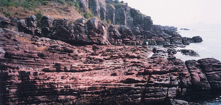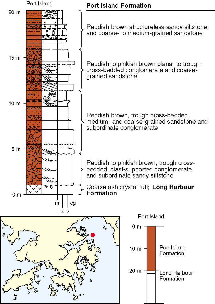 The Port Island Formation, which is interpreted as Late Cretaceous (Lai et al., 1996), is only exposed on small islands in Mirs Bay including Port Island, Round Island, Channel Rock and Shek Ngau Chau. The formation dips moderately (30º) to the east and southeast and unconformably overlies coarse ash crystal tuff of the Early Cretaceous Long Harbour Formation. Possible correlatives of the Port Island Formation have been recognized at Xiasha on the eastern side of Mirs Bay (Lai et al., 1996). The formation is also present in several marine boreholes, and is evident on seismic reflection profiles, in Mirs Bay (Fyfe et al., 2000). The formation is, therefore, thought to underlie much of Mirs Bay, and is estimated to be more than 1200 m thick. Ruxton (1960) described the type section of the formation from the southern tip of Port Island (Figure 8.3).
