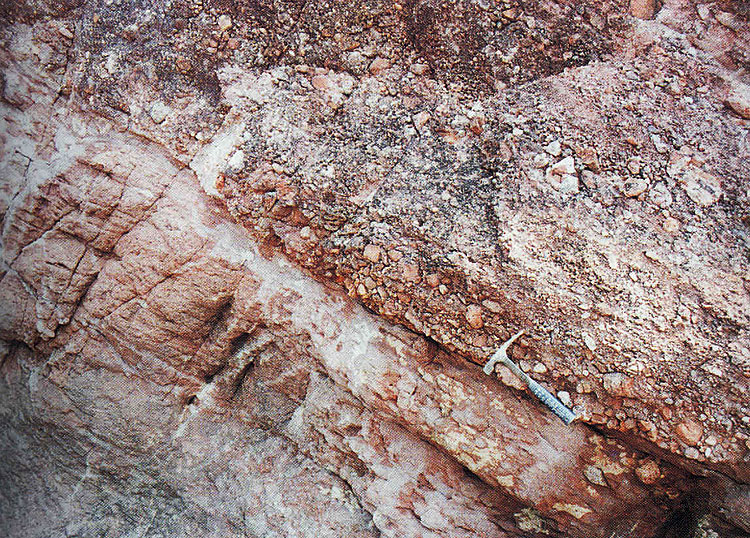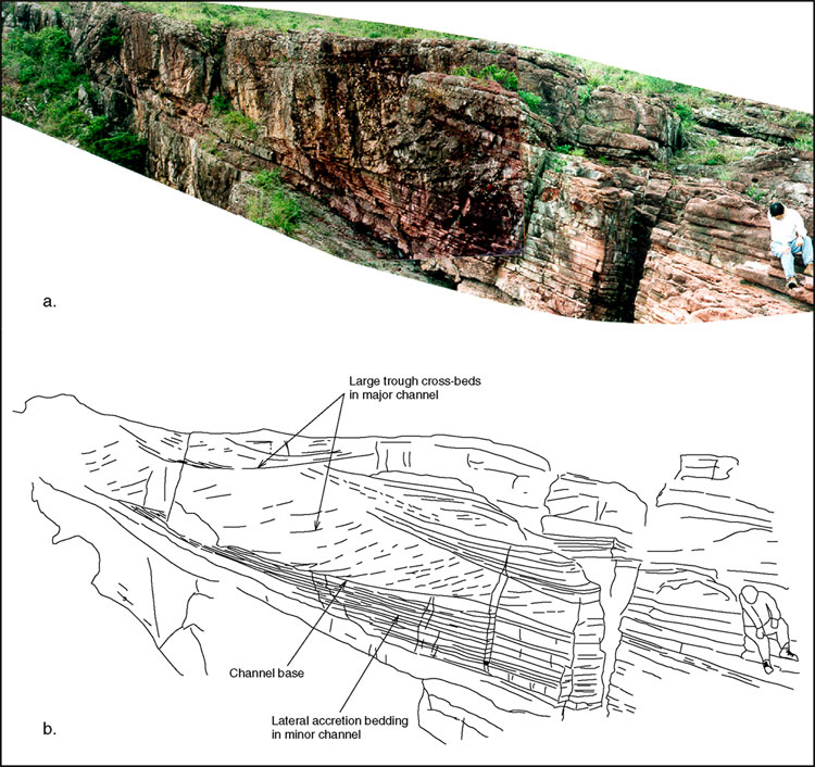 Two main facies have been recognized in the Port Island Formation (Jones, 1995): a channel facies and a floodplain facies. The channel facies (Plate 8.4) is dominant and is represented by major and minor channels. Major channel infills are between 3 and 6 m thick, and comprise reddish to pinkish brown, clast-supported conglomerate, and subordinate sandy conglomerate and pebbly sandstone. Trough cross bedding is the main sedimentary structure. Individual cross bedding sets vary from 0.3 to 3 m thick, and have a distinctive concave-upward base. Palaeocurrents measured from cross bedding sets indicate flows towards the eastsoutheast. Minor channels generally range from 2 to 4 m thick and they typically occur one above another. They also often overlie major channels. The minor channels are infilled with reddish to pinkish brown medium- to very coarse-grained sandstone, and very minor conglomerate. Small-scale cross bedding and faint parallel lamination may be present, but in general, sedimentary structures are uncommon. Each minor channel contains bedding that typically dips at a low angle (<10º). The sandstone beds are laterally continuous, vary from 0.1 to 0.4 m thick and often taper or thin down-dip.
