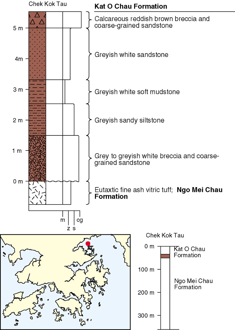 The Kat O Formation comprises dominantly calcareous breccia, conglomerate and coarse-grained sandstone and is distinguished from the Pat Sin Leng and Port Island formations by the presence of abundant calcite cement. The formation fills a small depositional basin bounded by faults in Ap Chau Hoi and Crooked Harbour. The formation is exposed at the coastline of Lau Fau Shan, and occurs in a marine borehole in Deep Bay, where it comprises granite clast-bearing breccia and sandstone.
