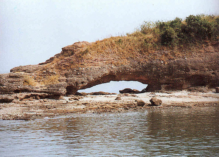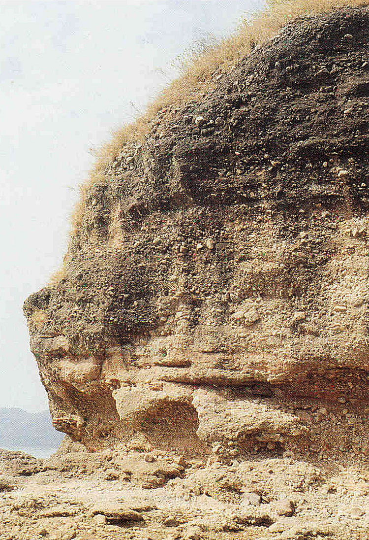 Ap Chau (including Sai Ap Chau, Ap Lo Chun, Ap Chau Pak Tun Pai and Ap Chau Mei Pak Tun Pai). The Kat O Formation on these islands is mainly reddish brown, thickly bedded breccia with thinly bedded coarse-grained sandstone, cemented with a calcareous and clayey matrix. Some veins are characterized by large crystals of calcite. Lithic clasts contain tuff, rhyolite and vein quartz and are 30 to 600 mm across. The bedding is gently dipping at 5-10o to the north. The strata are cut by minor normal faults. The calcareous minerals in the rocks are susceptible to marine erosion leading to the formation of sea caves, cliffs, arches and wave-cut platforms (Plate 8.A3). A large sea arch occurs at Kau Tau Shek (845630 846030 Kk-1), north of Ap Chau (Plate 8.A4).