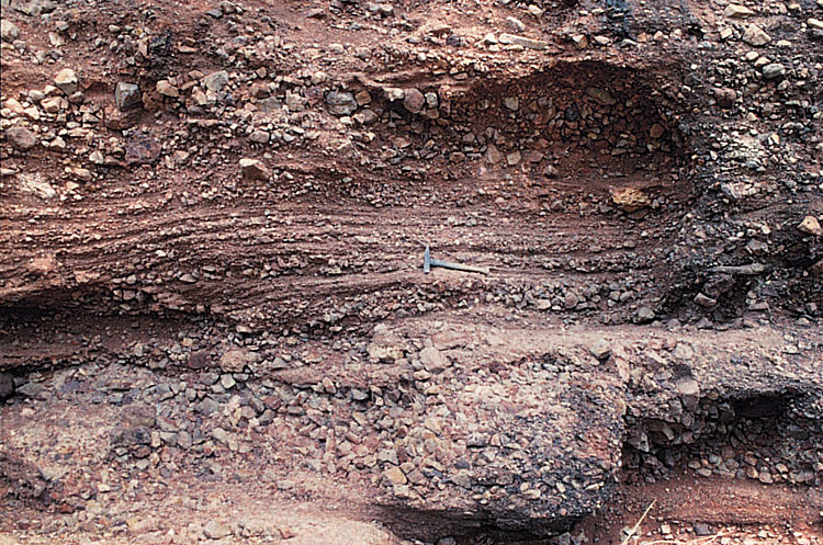 Cheung Pai Tau. The formation here comprises calcareous breccia with coarse sandstone. Bedding dips very gently, at 5o, to the north. A 15 m-wide fault zone, marking the southern margin of the basin, dips at 48o to the north. There is a block-bearing tuff within the fault zone that includes blocks of limestone, black mudstone, lava and tuff. The limestone is dark grey to light grey and pink, and is commonly cut by small veins of calcite (Williams, 1943). Fossils of Fusulina and Fusulinella of Permian age were recovered from one limestone clast (Lee, in Williams, 1943). A quarry where the limestone was extracted is now disused and flooded.