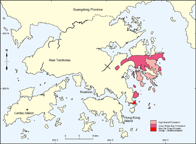 Clear Water Bay Peninsula and Ninepins Group. In the Tai Au Mun area a significant fault can be traced parallel to the coastline, downthrowing the Clear Water Bay Formation against trachydacite lava. Columnar jointing is well developed, and close to the fault (848770 817050 Kkw-1) the columns have been bent through 120o. Between Tai Au Mun (848300 817300 Kkw-2) and Lung Ha Wan (849300 818900 Kkw-3) exposures are few, except along the coast, where columnar jointing is commonly seen in the steep cliffs.