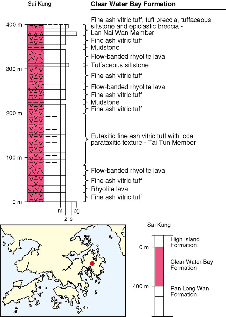 The Clear Water Bay Formation (Table 5.7) crops out in eastern Kowloon and the eastern New Territories south of the Chek Keng Fault (Figure 5.24). The formation is at least 400 m thick and contains several trachydacite to high silica rhyolite lava flows (Plate 5.31) interbedded with fine ash tuffs, tuffaceous mudstones, and tuffites (Figure 5.25). Two members are recognized: the Tai Tun Member and the Lan Nai Wan Member. High precision U–Pb zircon age-dating has returned an age of 140.7 ± 0.2 Ma for the formation (Davis et al., 1997).