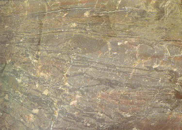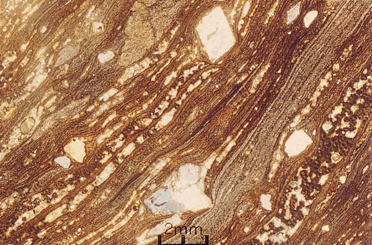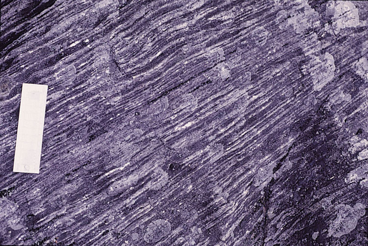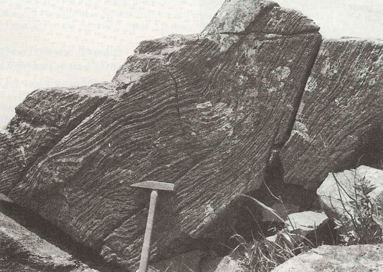 The outcrops on Ma On Shan are divided by a major northeast trending fault which downthrows stata to the southeast. Exposures of tuffs on this downthrow side are pale grey, coarse ash bearing fine ash tuffs which contain common vitric shards, sometimes visible in hand specimen. Crystals are mainly of feldspar, some of which show a blue iridescent schiller effect. Welding is well developed and in places (844000 829500 Kkw-35) columnar jointing can be seen. Welding fabric develops into a strong parataxitic fabric which resembles flow folding (844180 829400 Kkw-36) but thin sections can be used to distinguish these tuffs (HK 822, Plate 5.A10) from adjacent flow banded rhyolite lava (HK 823, 844510 829150 Kkw-37).