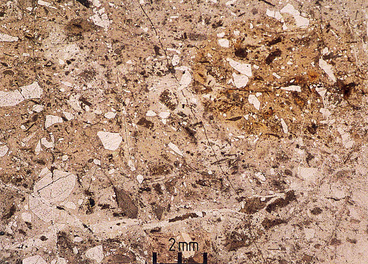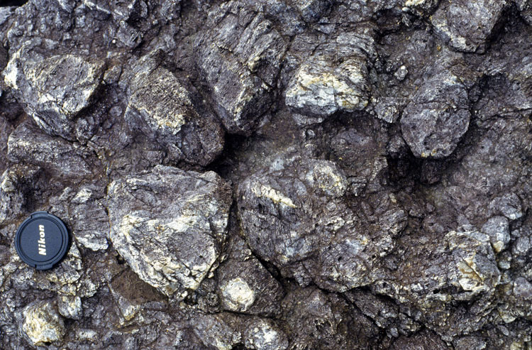 In the vicinity of Kai Kung Shan, the formation rests unconformably on coarse ash tuff of the Long Harbour Formation. South of Kai Kung Shan (847970 830570 Kkw-32), crystal-bearing fine ash vitric tuff with occasional fiamme lies on the coarse ash tuff. Immediately above, a tuff-breccia horizon, several metres thick, contains angular lithic fragments, mainly of fine ash and coarse ash tuff.