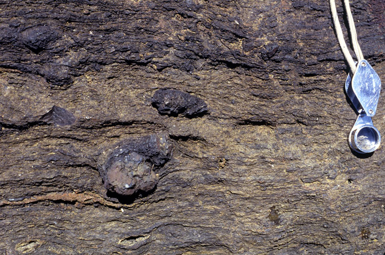 Sharp Island and Wong Yi Chau. The eutaxitic character is well seen in the coastal exposures around Wong Yi Chau (850800 828090 Kkw-24), where steep easterly dips are seen in the strata. Occasional aphanitic clasts up to 20 mm across stand out, with the fiamme forming a flow fabric around these clasts (Plate 5.A32). In places the fiamme are stretched out to give a streaky parataxitic fabric. On Sharp Island the Tai Tun Member is steeply dipping and layered between massive flow-banded lavas. The eutaxite is well exposed along the shoreline, where it rests on a brecciated lava surface (848600 824400 Kkw-25).