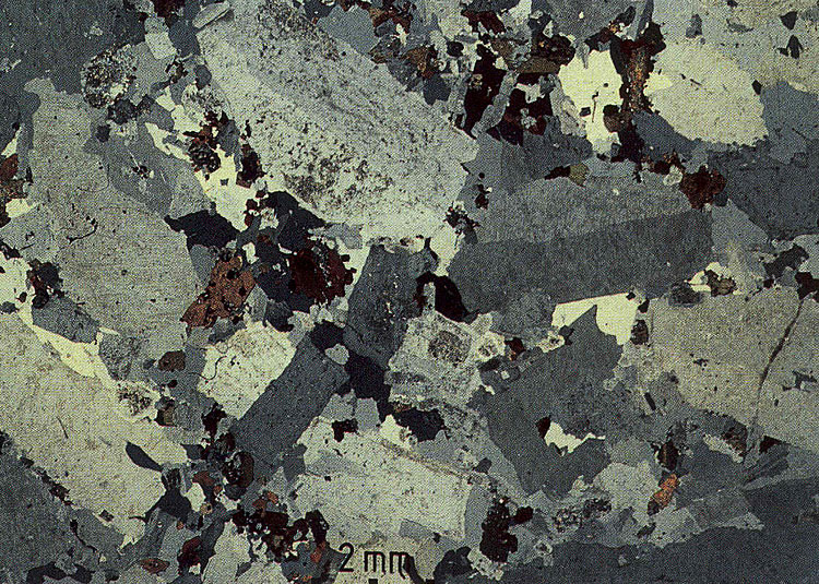 The D'Aguilar Quartz Monzonite is typically porphyritic and fine to medium grained (Plate 6.20). Large (5–10 mm) euhedral to subhedral phenocrysts of oriented mesoperthite are set in a granular matrix comprising euhedral to subhedral (2–3 mm) strongly concentrically-zoned andesine to oligoclase, subordinate anhedral quartz and minor euhedral green amphibole and brown biotite. The matrix comprises quartz, alkali feldspar, and plagioclase with accessory minerals including zircon, allanite, apatite, and Fe-oxide.