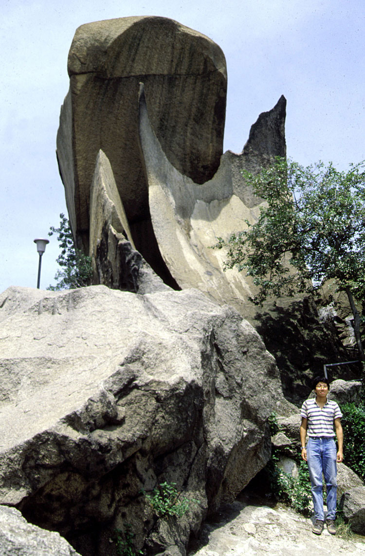 Tate's Cairn. Numerous bodies of coarse-grained granite, fine-grained granite and quartz monzonite crop out on Man Tau Tun (839300 824610 Klk-24), at Kong Pui Tsuen (839660 824920 Klk-25), Ngau Au Shan (840600 825530 Klk-26) and in Shek Nga Pui (841400 825880 Klk-27). The coarse-grained granite sheets vary from 20 to 180 m wide and are identical in appearance to the altered and discoloured granite bodies, for example, near Amah Rock. The trend of the intrusions is parallel to known northeast-trending faults lying to the northeast, but none of these faults can be traced through these outcrops. In view of this, the intrusive separation of the sheets is thought more likely.