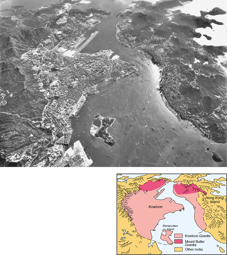 The Kowloon Granite (Table 6.5) forms a subcircular biotite monzogranite pluton centred on Kowloon and Hong Kong Island (Plate 6.24). The northern boundary of the pluton is along the southern foot of the hills between Kowloon and Sha Tin districts. In the east and south, the pluton boundary is marked by hills comprising the volcanic roof rocks (Figure 6.6) but volcanic rocks are not generally exposed along the western boundary except at Stonecutters Island. The Kowloon Granite is remarkably uniform in texture and composition and is typically an equigranular medium-grained, biotite monzogranite (Plate 6.22). Plagioclase is strongly concentrically zoned and microcline is the dominant alkali feldspar with subordinate microperthite. The dominant mafic mineral is green to brown biotite, occurring as single flakes (1–3 mm). Accessory minerals include allanite, apatite, zircon and Fe-oxide. Porphyritic fine-grained granite in Kings Park in central Kowloon, fine-grained granite along the northern boundary of the pluton and in the vicinity of Ma On Shan, and small outcrops of coarse-grained granite near Kwun Yam Shan are minor textural variants. The granite typically contains quartz and plagioclase megacrysts set in a matrix of quartz, alkali feldspar and plagioclase with abundant biotite. Titanite and allanite crystals are unusually large. The petrographic features of the Kowloon Granite, particularly the strongly zoned plagioclase, are similar to those of the Lantau Granite. However, there is a notable absence in the Kowloon Granite of amphibole and feldspar megacrysts.