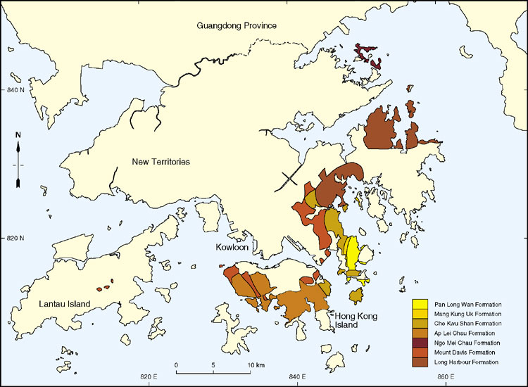 The Mang Kung Uk Formation (Table 5.6) crops out mainly in the vicinity of the Clear Water Bay Peninsula (Figure 5.16) where it conformably overlies the Silverstrand Member of the Che Kwu Shan Formation. Further north, in the Sai Kung and Tai Long Wan areas, the formation has been mapped as conformably overlying the Long Harbour Formation.