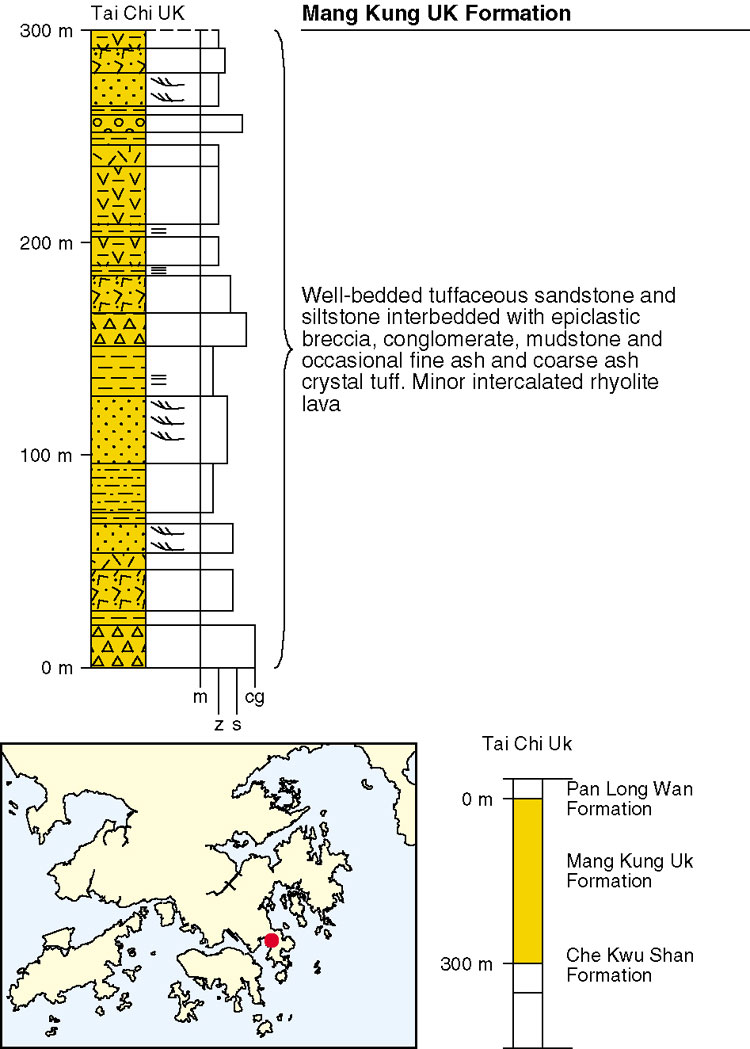 The Mang Kung Uk Formation, which is up to 300 m thick, is dominated by alternations of well-bedded tuffite, epiclastic breccia, conglomerate, mudstone, siltstone and sandstone (Plate 5.29). Graded bedding is a feature of some sandstone units. Thick fine ash and coarse ash tuff units, with occasional intercalated rhyolite lavas, are also present (Figure 5.22). The type locality is at Mang Kung Uk Village, towards the northern end of the Clear Water Bay Peninsula.