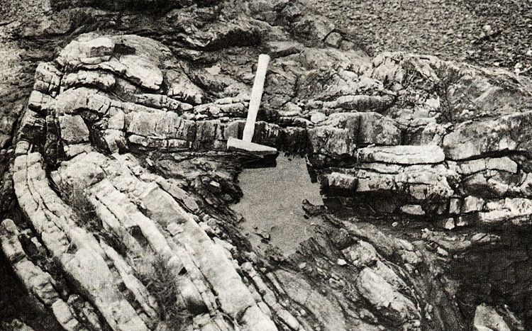 The lower facies on Ma Shi Chau comprises dark grey mudstone and pale grey to pink calcareous siltstone with lenses and interbeds of sandstone. The argillaceous rocks are generally well-laminated, with syn-sedimentary slump folding in places (Plate 3.8). The sandstone lenses exhibit low-angle cross bedding and are graded with occasional clasts along their bases (Jones, 1996). This unit has yielded a varied fossil assemblage, including a marine fauna and several plant fragments (Yim et al., 1981; Nau, 1980). Similar rocks are exposed on Centre Island where thin quartzitic sandstone is interbedded with dark argillaceous siltstone, which has yielded plant fossils (Nau, 1980).