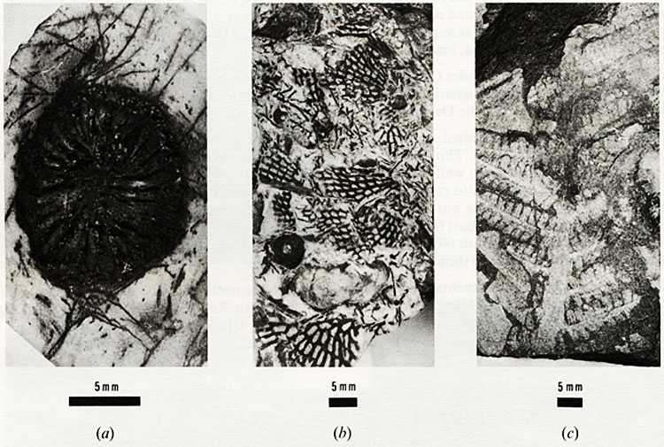 The sequence is divided into two lithofacies following Nau (1980). However, the outcrop is considered to be structurally too complex to warrant formal sub-division. The lower facies consists of a sequence of pale grey, pink-weathered, slightly calcareous siltstones, dark grey mudstones, siltstones and sandstones (842150 835230 Pt-2). The sandstones form layers up to 0.5 m thick. They are moderately even-bedded and persistant along strike, except where faulted. The dark grey mudstones and siltstones are occasionally ferruginous and contain pyrite nodules and, according to Nau (1980), in places contain plant remains. The pink-weathered, pale grey calcareous siltstones contain assemblages of poorly preserved marine fossils including molluscs, corals, bryozoans, brachiopods and crinoids (Plate 3.A8). Interbedded strata have also yielded plant remains (Nau, 1980) (Plate 3.A8).