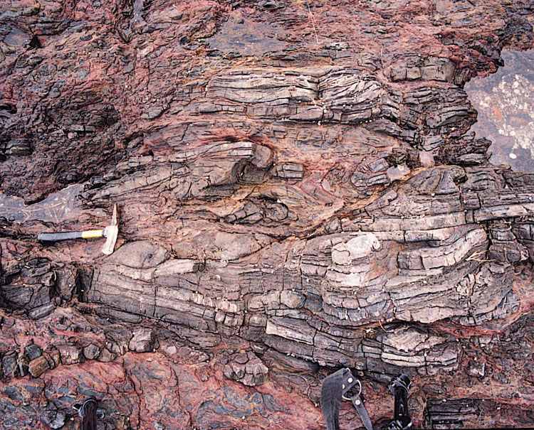 Ma Shi Chau (type area). The strata on Ma Shi Chau are structurally complex, and the interpretation of stratigraphic relations within the formation is extremely difficult. The strata are involved in syndepositional slump folds as well as a series of northerly plunging minor anticlines and synclines, the limbs of which are often sheared and overturned (Plate 3.A7).