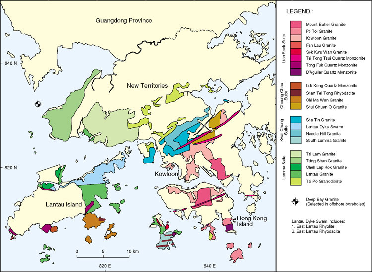 The Deep Bay Granite subcrops offshore to the west of the Deep Bay Fault in the western New Territories (Figure 6.1). Contacts with older rocks in Hong Kong have not been observed. Fresh rock recovered from fourteen marine boreholes in Deep Bay consists of weakly deformed, fine- to medium-grained, two-mica monzogranite. In thin section, quartz, alkali feldspar, and plagioclase form a subhedral-granular texture with subordinate reddish-brown biotite and muscovite. Fluorite, zircon and monazite are the main accessory minerals.