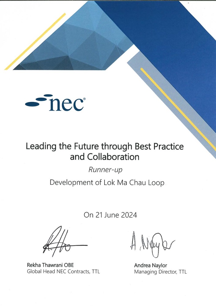 The Development of the Loop has earned recognition as the Runner-up for the NEC Martin Barnes Awards 2024 in the category of Recognising Project Excellence and Innovation. This award highlights engineering projects that embrace innovative construction techniques and materials to tackle environmental challenges. Civil Engineering and Development Department applied several advanced methods in the Development of the Loop project, enhancing construction quality and safety while significantly reducing construction time, including building an Ecological Area (EA) for creating land for development while conserving ecology; adopting revolutionary bridge construction method for enhancing site safety; embracing digitalisation technologies for ensuring project efficiency; and using new prestressing technology for achieving less maintenance.