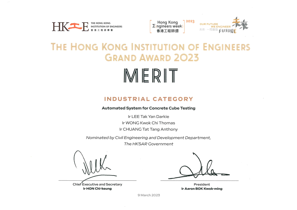 The Automated System for Concrete Cube Testing developed by the Public Works Laboratories received a Certificate of Merit in the Hong Kong Institution of Engineers Grand Award 2023 - Industrial Category