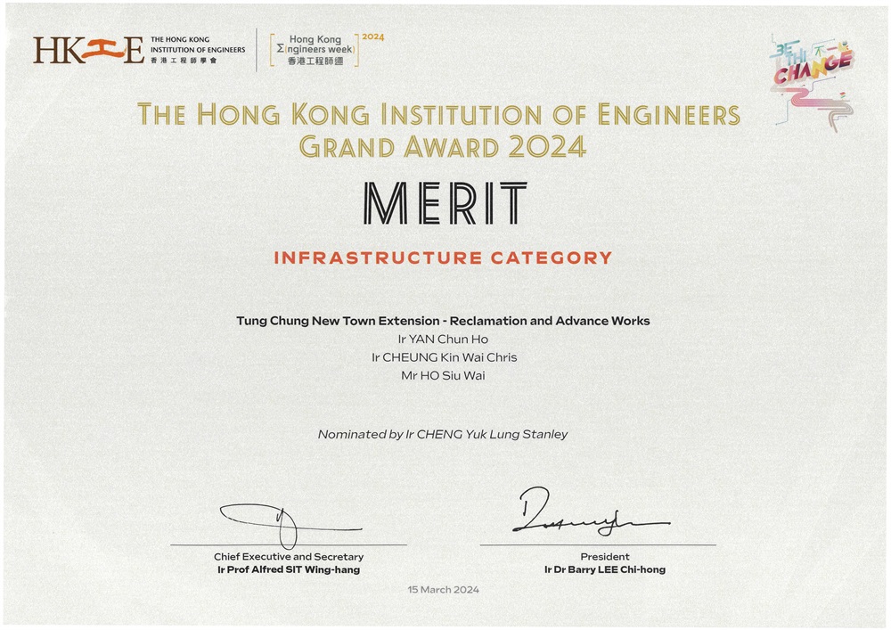 Tung Chung New Town Extension – Reclamation and Advance Works received Certificate of Merit in the Hong Kong Institution of Engineers Grand Award 2024 - Infrastructure Category