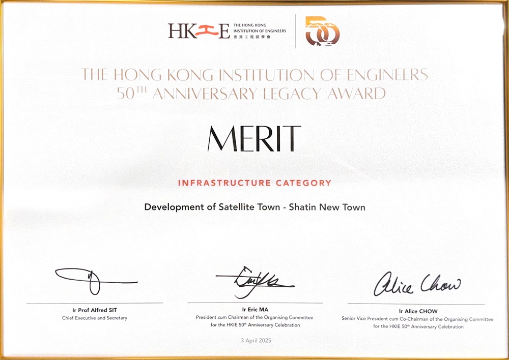 To celebrate its 50th anniversary, the HKIE established the Legacy Award, comprising three categories, namely Innovation, Industry, and Infrastructure, to honour exceptional engineering projects and technologies that have delivered profound benefits to the engineering sector, industry and society in Hong Kong and globally over the past half-century. We were honoured to receive the Certificate of Merit in the Infrastructure Category at the Hong Kong Institution of Engineers 50th Anniversary Legacy Award for the "Development of Satellite Town – Shatin New Town".