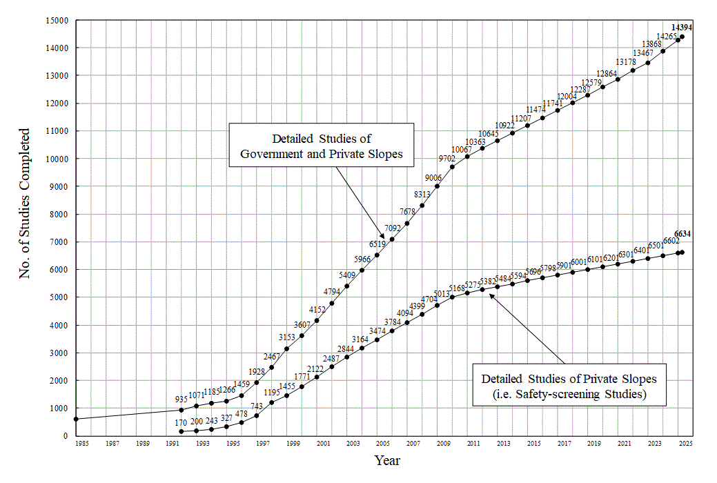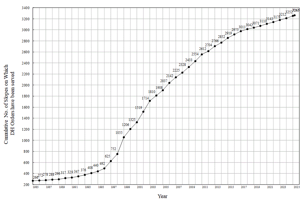 Where found necessary by a Preliminary Study or a Detailed Study, a DH Order is served by the Buildings Department on the owners of the private slopes on the recommendation of the GEO. The DH Order requires the owners to carry out certain investigation and the necessary upgrading works to the slope. A DH Order may also be recommended to be issued after a slope failure has occurred, or as a result of other stability concerns brought to the attention of the GEO. The cumulative number of slopes on which DH Orders have been served by the Buildings Department is shown in Figure 2.