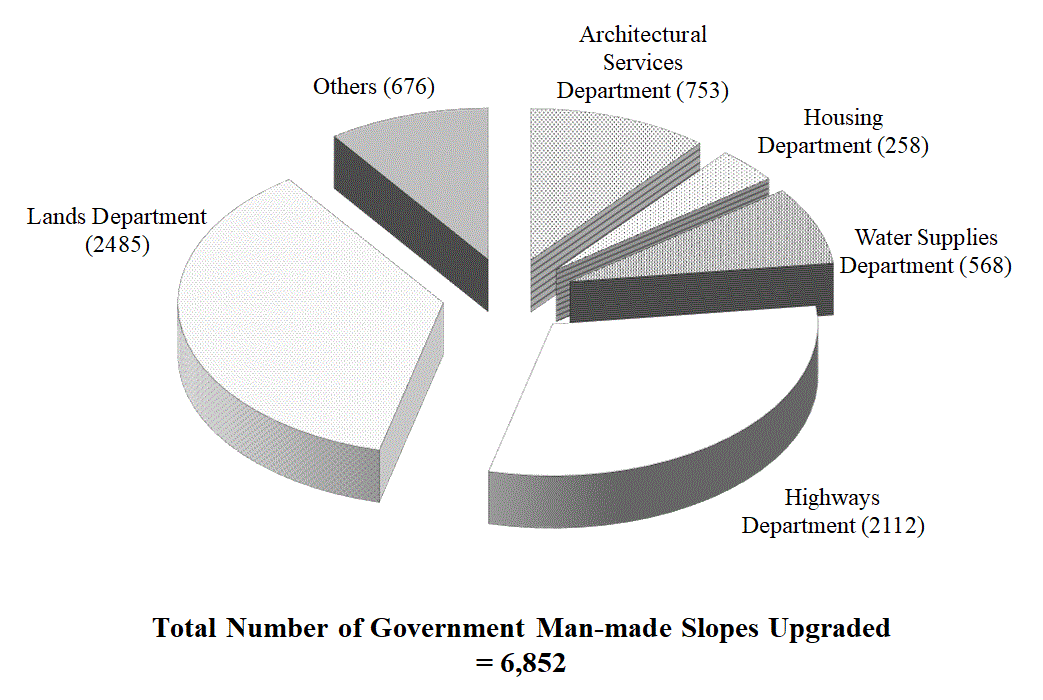 Where Government man-made slopes are found to be below current safety standards, they are recommended for upgrading works. The selection of Government slopes for Detailed Studies and upgrading works is referred to an inter-departmental committee, the Landslip Preventive Measures Committee (LPMC) for consideration, advice and agreement. The LPMC also considers nominations for upgrading works by Government departments responsible for slope maintenance. The cumulative number of man-made slopes upgraded (including those checked to meet the current safety standards) by the GEO since 1977 and the breakdown of the number of Government slopes that were upgraded are given in Figures 3 and 4 respectively.