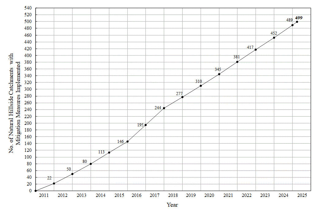 Upon the endorsement by the ExCo and LegCo of the inclusion of mitigation measures for natural hillside catchments in the LPMitP in late 2007, the GEO commenced the preparation work immediately, which involved studies of vulnerable natural hillside catchments and related catchments in accordance with the risk-based priority ranking system for systematic implementation of the necessary mitigation measures. The cumulative number of natural hillside catchments with mitigation measures implemented by the GEO is shown in Figure 5.