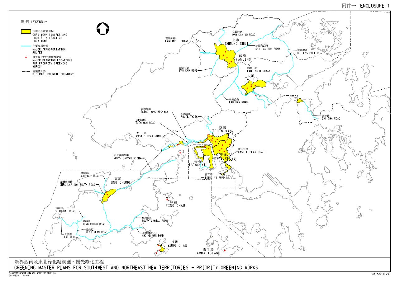 Planting and establishment of about 1 850 trees and 830 000 shrubs in the New Territories Southwest and Northeast, which are classified as priority greening works in accordance with greening effect and public aspirationsProject Office in Civil Engineering and Development Department: