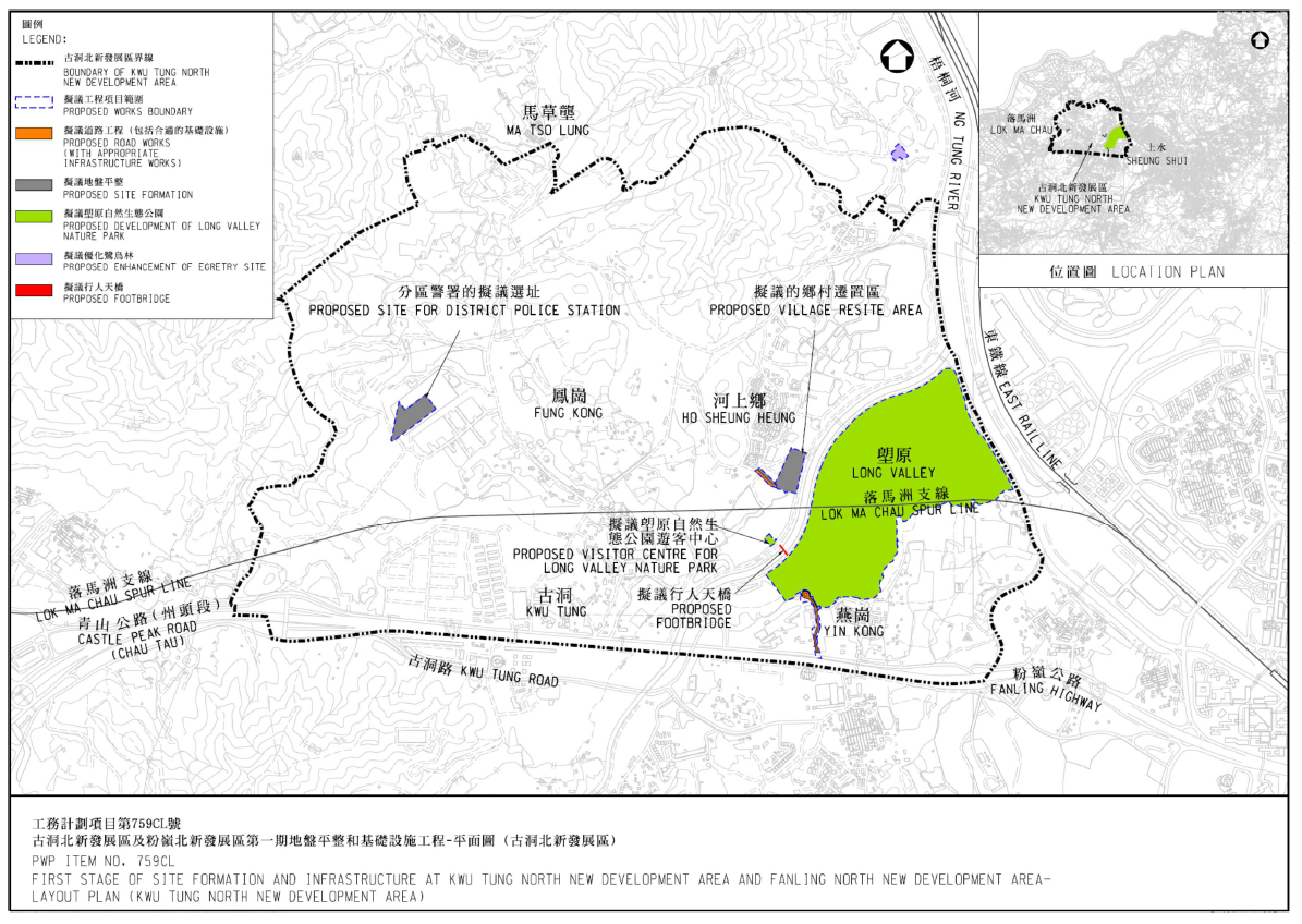 | Scope: | The contract mainly comprises road and drainage works between Kwu Tung North New Development Area and Shek Wu Hui; construction of a sewage pumping station, a Long Valley Nature Centre and a footbridge spanning across Sheung Yue River; and site formation of land and the associated engineering infrastructure works for a village resite area in Kwu Tung North New Development Area. |