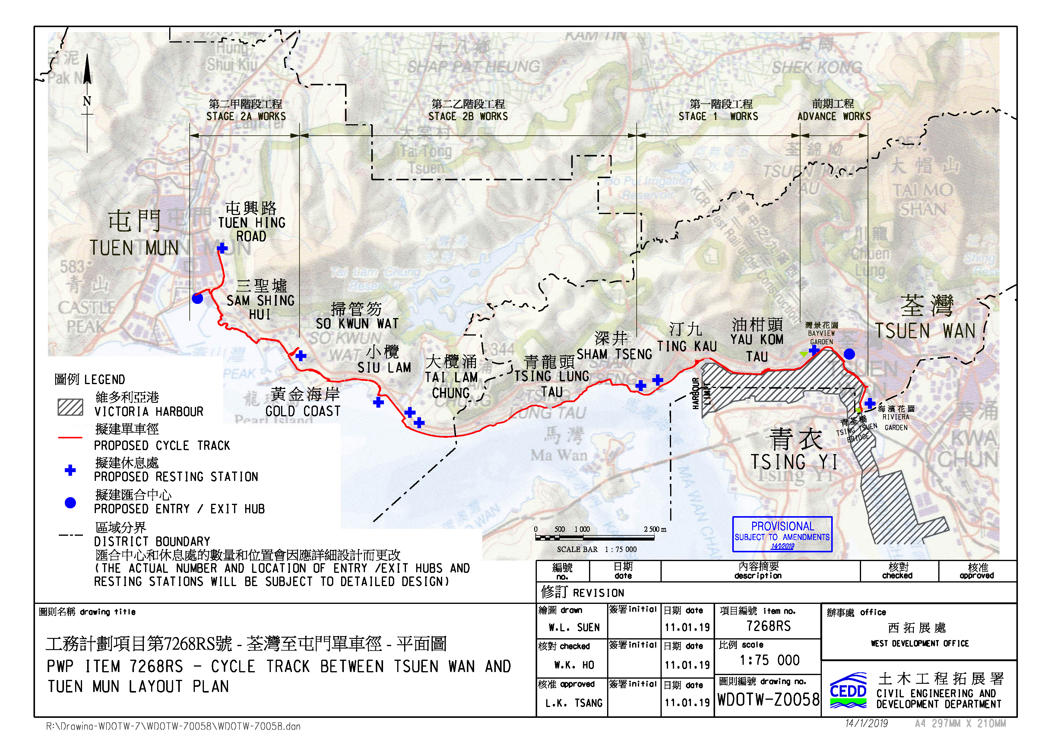 The 20-kilometre cycle track between Tsuen Wan and Tuen Mun is being implemented in phases. The Tsuen Wan waterfront section (Advance Works) was opened for public use in July 2021. The remaining section of cycle track between Tuen Mun and Tsuen Wan Bayview Garden is under planning.
