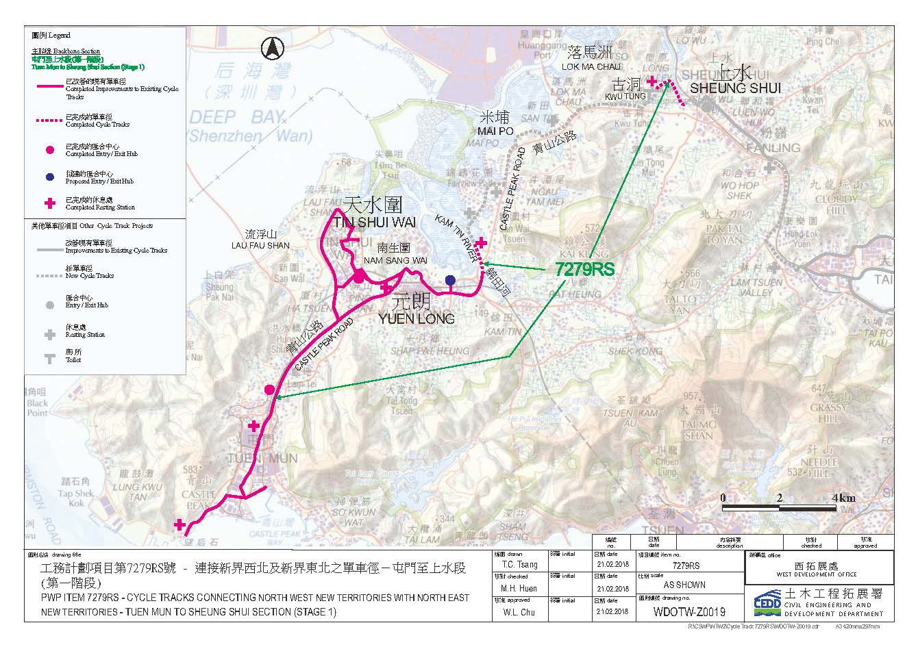 The project forms part of the NT Cycle Track Network which connects local cycle track networks in various new towns and is mainly for recreation purpose. The works under this project comprise the construction of approximately 2.5 km new cycle tracks in Yuen Long and Sheung Shui, improvement works to about 4.5 km in length of selected sections of existing cycle tracks in Tuen Mun, Tin Shui Wai and Yuen Long together with the provision of supporting facilities.