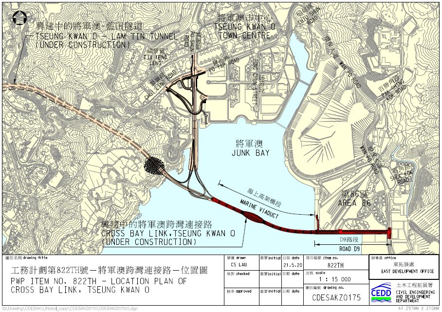 Cross Bay Link (CBL) connects Tseung Kwan O – Lam Tin Tunnel (TKO–LTT) to Wan Po Road in Area 86 of Tseung Kwan O (TKO). It provides an alternative access route to the south-eastern part of TKO, so as to cope with the anticipated traffic demand in TKO. With the completion of CBL, traffic from the south-eastern part of TKO can commute to and from the western part of TKO via CBL, as well as commute to and from Kowloon East via TKO–LTT, without travelling through Wan Po Road and TKO town centre. Hence, the traffic load to these roads during peak hours is relieved, and thereby minimising the traffic and environmental impacts on residents in the vicinity.