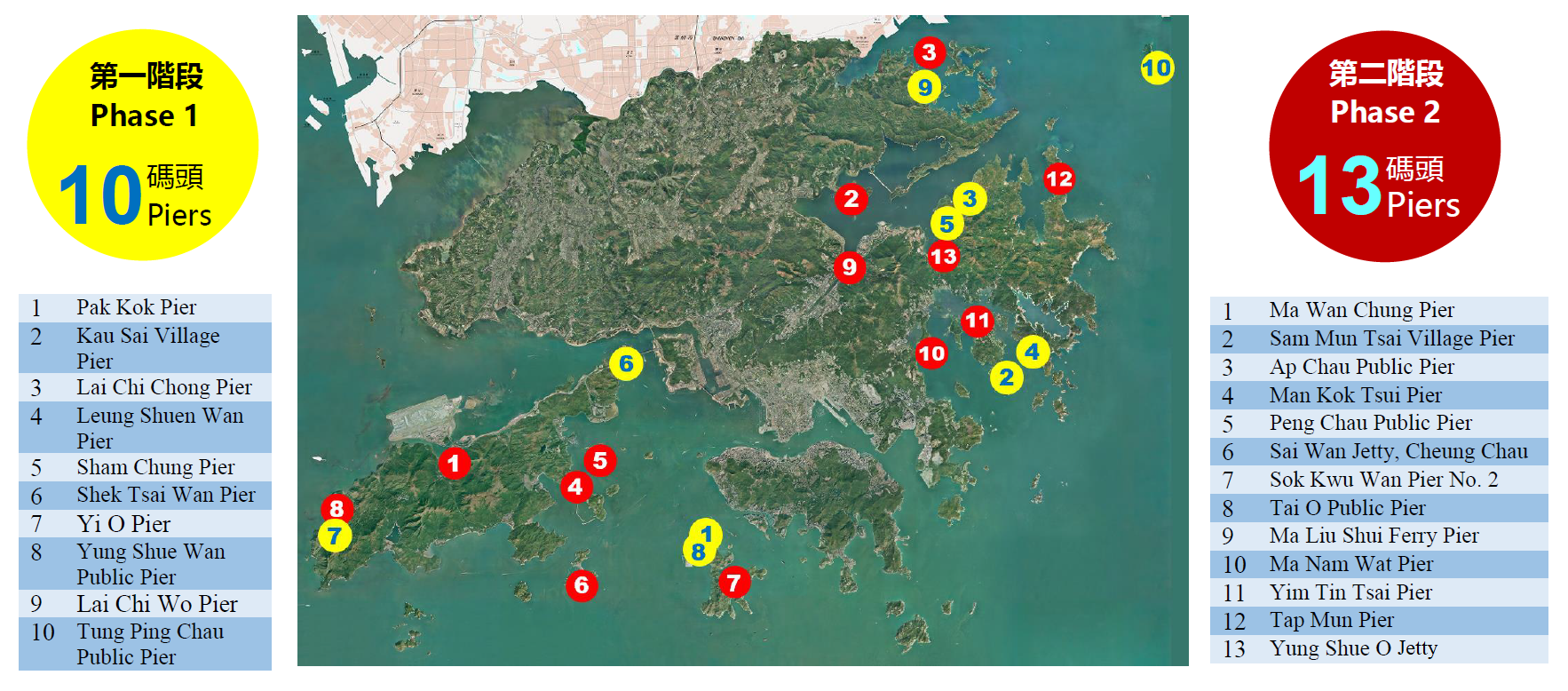 In recent years, the Government has been implementing the Pier Improvement Programme (PIP) to improve the public piers in remote rural areas of the New Territories and the outlying islands in phases, with an aim to enhance the accessibility to scenic and natural heritage attractions and support the development of green tourism while fulfilling the basic needs of the local villagers who rely on boats as their major transport mode and the operational needs of fishermen.