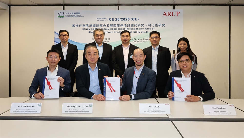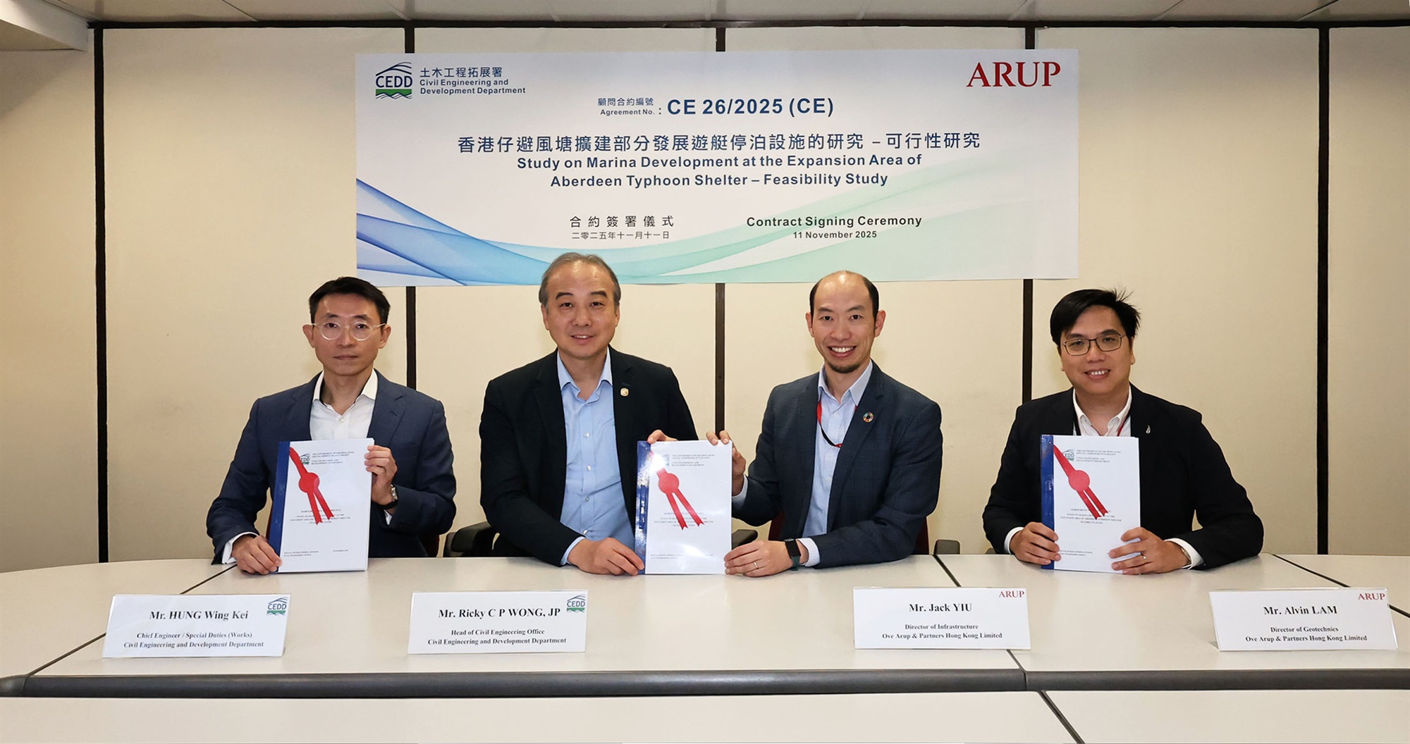 The Civil Engineering and Development Department (CEDD) signed a consultancy agreement of HK$12.4 million on 11 November 2025 with Ove Arup & Partners Hong Kong Limited for Study on Marina Development at the Expansion Area of Aberdeen Typhoon Shelter.
