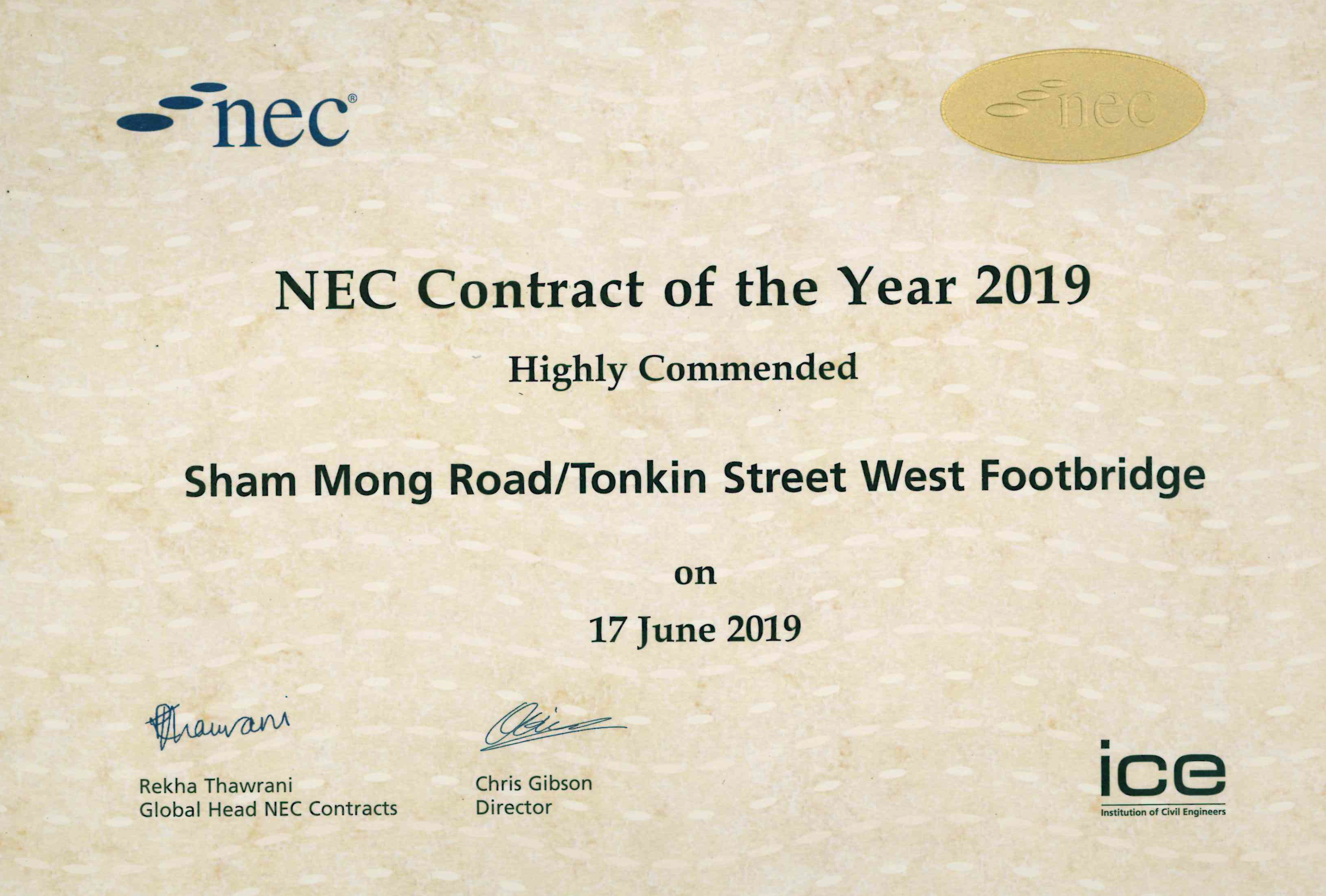 工程项目采用「新工程合约」模式(NEC),并秉持「伙伴合作」精神推展。土木工程拓展署、承建商、工程师及驻工地人员透过风险管理会议及预早通报机制,努力合作以降低工程预期的风险及减少争议。工程团队采用NEC的努力及成效得到业界认同,工程项目获英国土木工程师学会颁发「新工程合约 2019 — 最佳工程项目」组别的高度讚扬奖项。