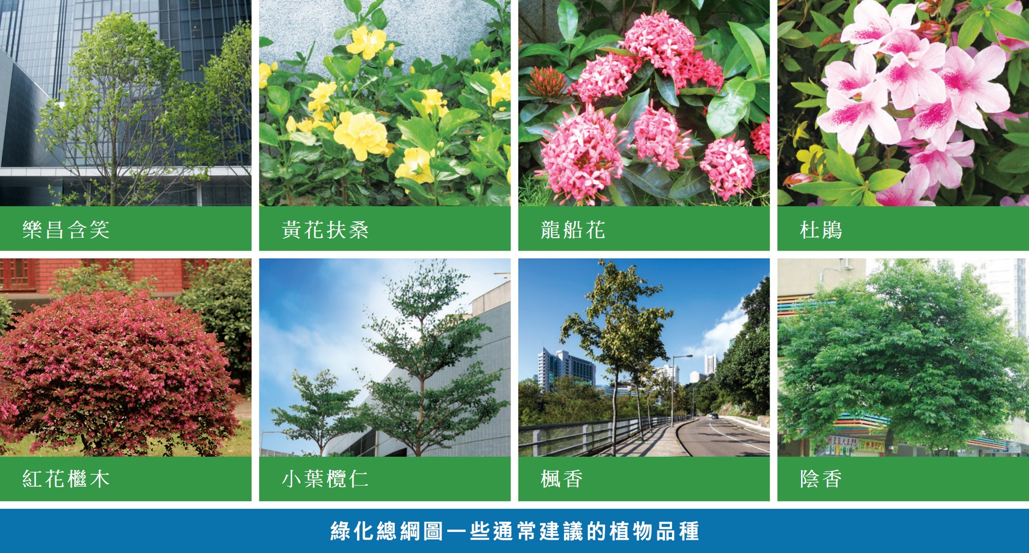 為了更切合市民對健康和生活質素的要求,我們在大部份主要基建工程內都加入種植計劃,作為景觀/生態的改善及緩解措施。綠化工程涉及不同的環境,包括道路兩旁、行人和行車天橋、平台、斜坡、河道與海濱走廊等。