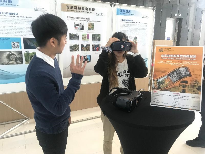 工程師向在場嘉賓介紹有關香港斜坡安全及新進科技的展板,以及山泥傾瀉虛擬實境體驗,皆深受參加者歡迎。