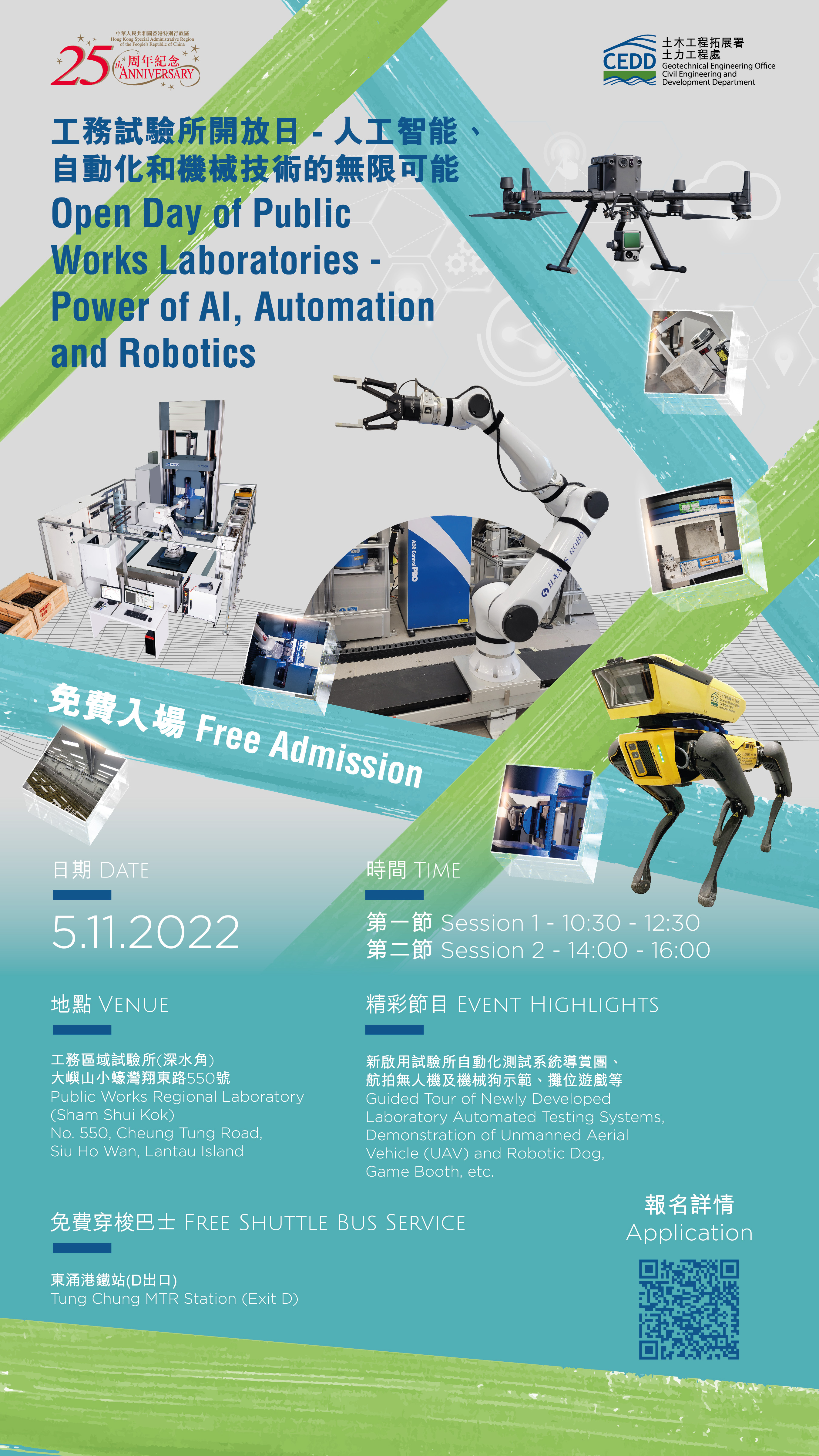 為慶祝香港特別行政區成立25周年,土木工程拓展署將於2022年11月5日(星期六)舉辦工務試驗所開放日。巿民屆時可參加由本署同事帶領的導賞團參觀新啟用試驗所自動化測試系統,以及航拍無人機及機械狗示範和攤位遊戲等。