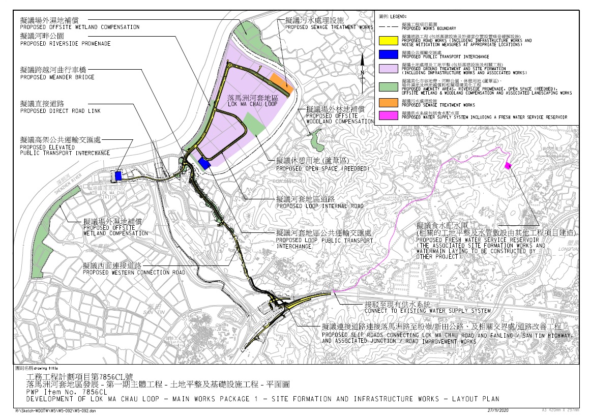 | 範圍: | 工程主要包括進行土地處理及工地平整工程;在河套區內興建行車道、行人路、單車徑,以及1個公共運輸交匯處;興建第一期西面連接道路,包括擴闊現有下灣村東路、建造行人路、單車徑、斜坡和擋土牆,以及建造1條橫跨舊深圳河河曲的行車橋;興建其他基建設施,包括1所三級污水處理設施及污水收集系統、供水系統、排水系統,和其他相關工程;以及實施緩解環境影響措施,包括在場外補闢約18公頃的濕地和約1.3公頃的林地。 |