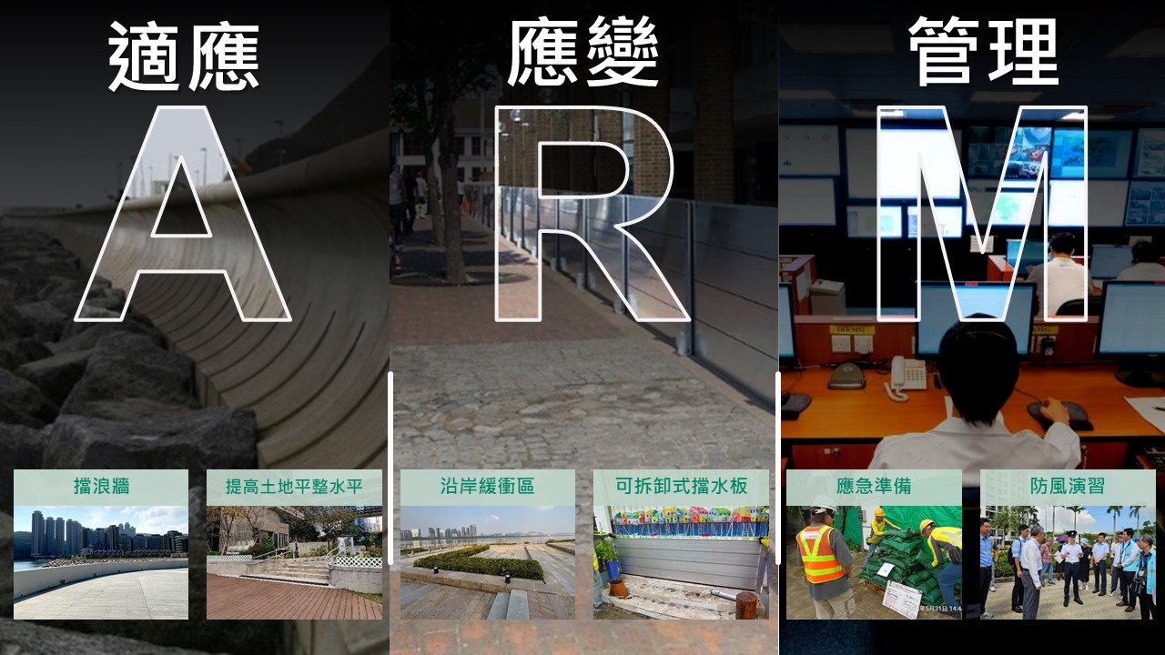 - 「適應」- 以「循序漸進」的原則繼續有序地推展各類型的沿岸改善工程,以減輕水浸的影響;