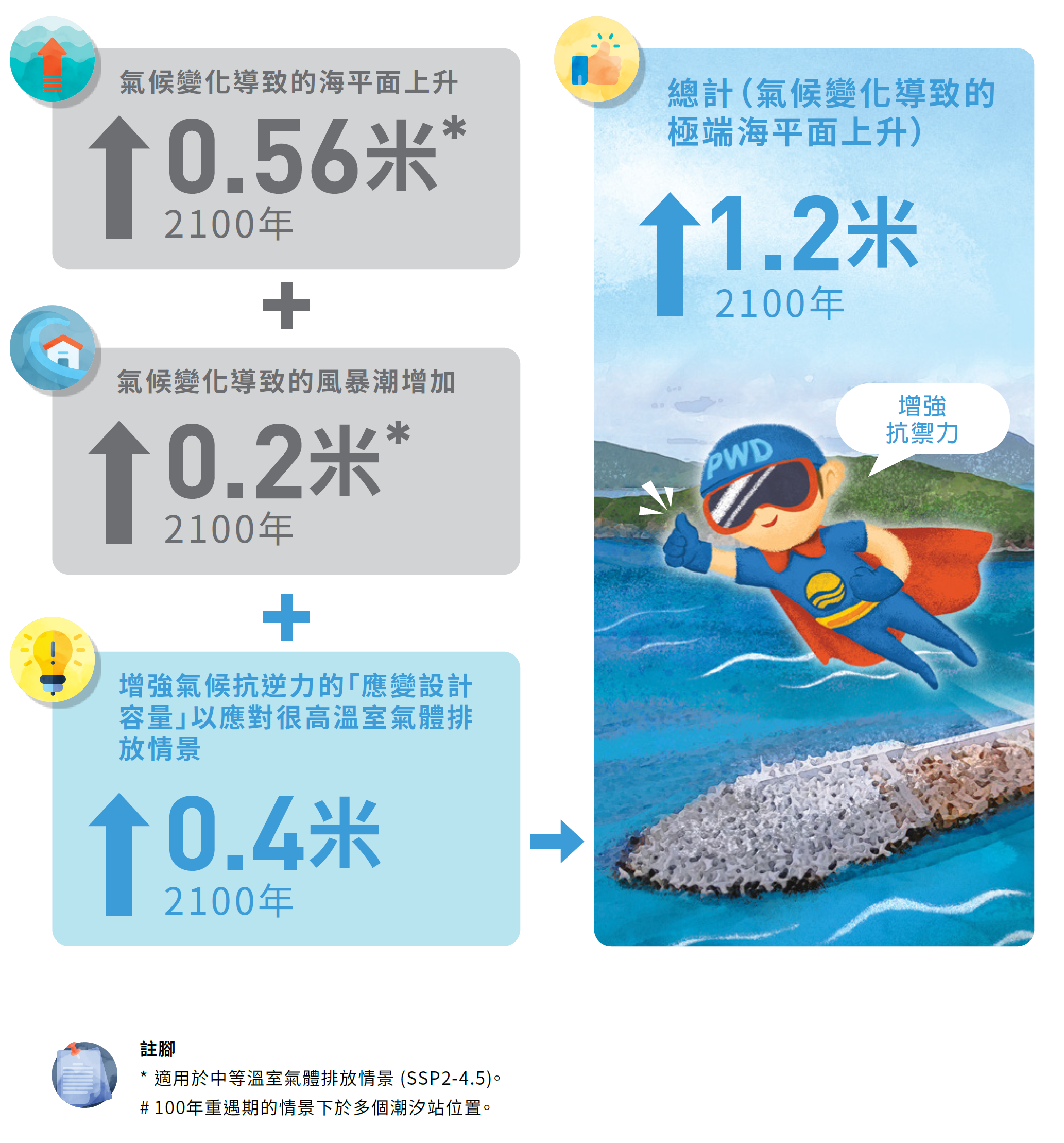 視乎各國為減少溫室氣體排放所採取行動的成效,有關影響於本世紀末時則存在較大的不確定性,其在中等和很高溫室氣體排放情景下於本世紀末時的差別則較為顯著。因此,我們會按照循序漸進的原則, 採用適應、應變和管理的綜合策略,以應對氣候變化影響下而可能增加的水浸風險。