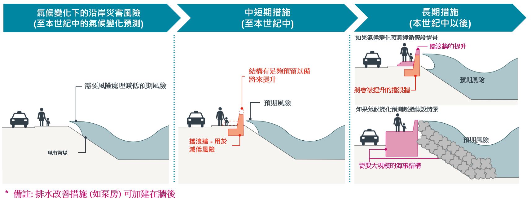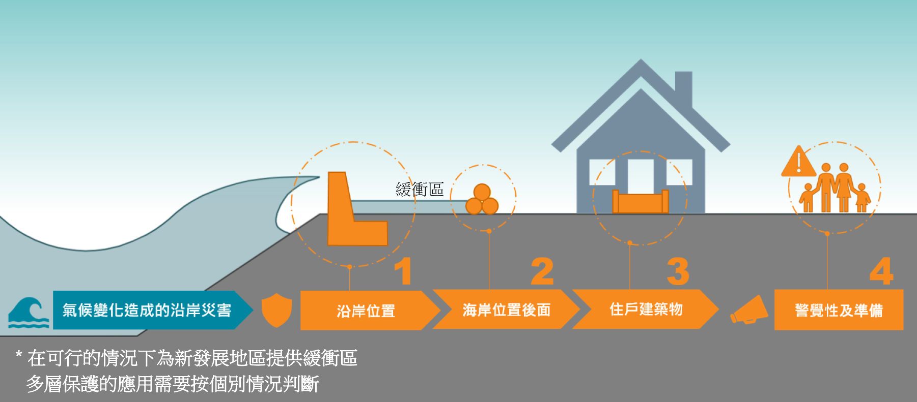 - 第一層 : 在沿岸位置設立「適應」措施作第一道防線,例如加建或提高擋浪牆,以減少沿岸災害;