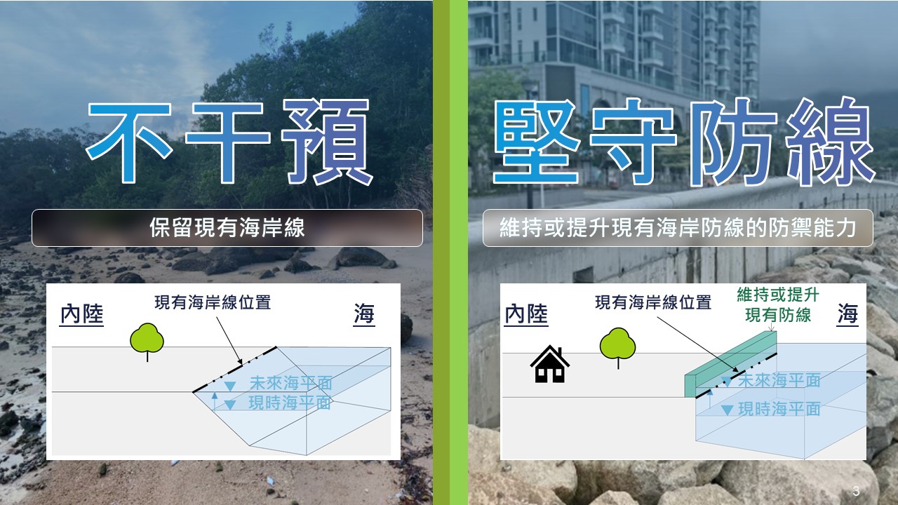 按現時估算, 就本世紀中而言,氣候變化為本港沿岸地區帶來的淹浸風險屬於可管控的程度。「不干預」和「堅守防線」策略不但可因應本港沿岸情況有效管理風險,還可減少對珍貴土地或海洋資源的影響。