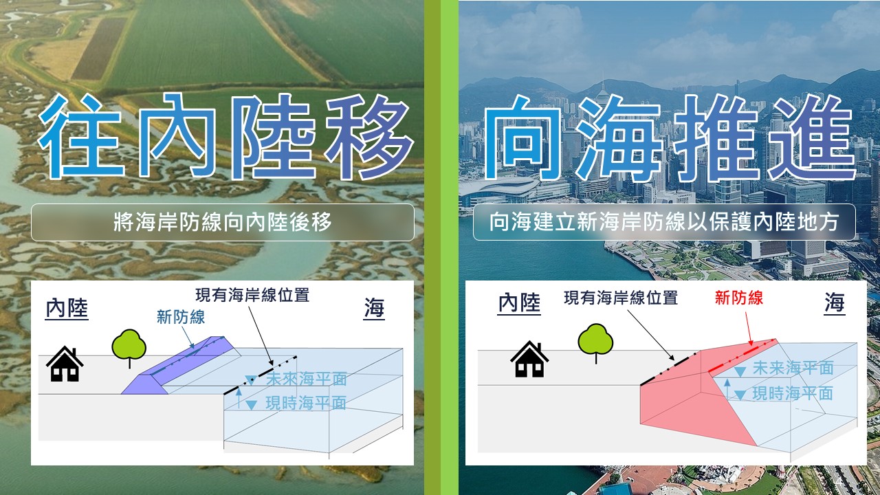 - 「往內陸移」 : 將海岸防線向內陸後移;及